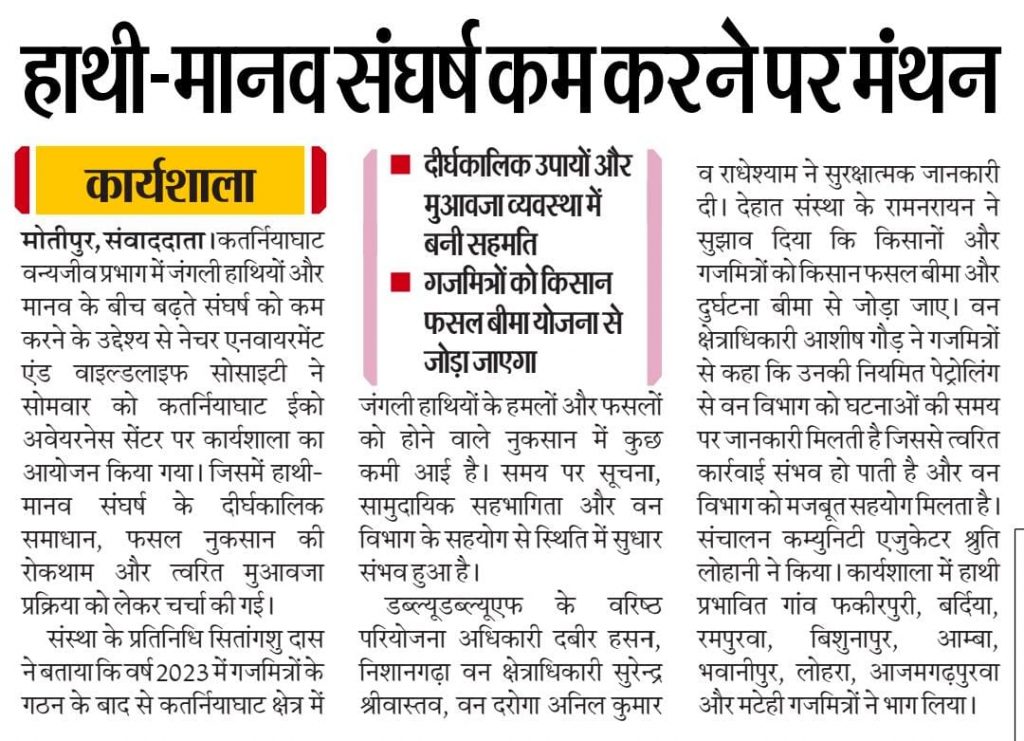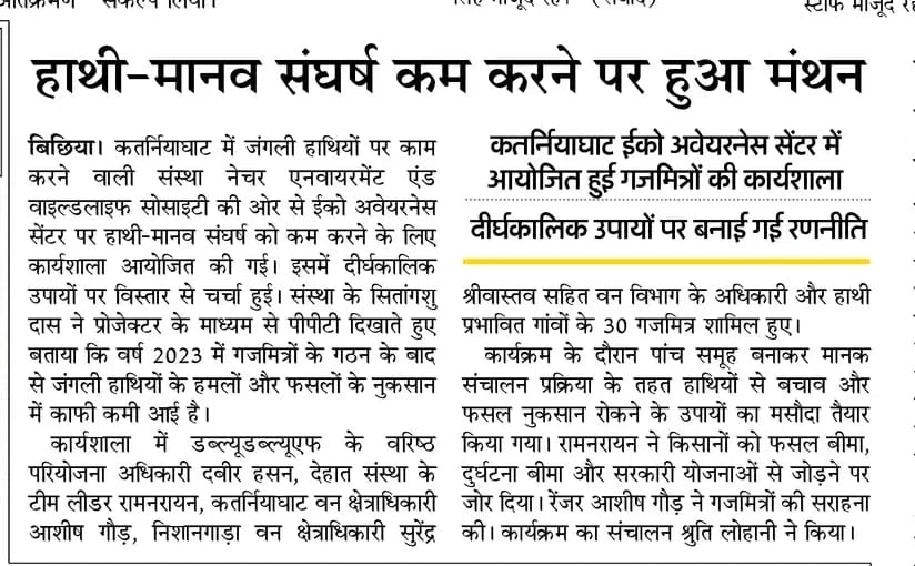 #Gaj Mitra team will protect villagers from wild elephants Bichiya (Bahraich). In the villages adjacent to the forest, the Gajmitra team will protect the villagers from #elephants. For this, the #Gaj Mitra team has been formed by the #Nature Environment and Wildlife Society (News). The Gajmitra team will go from village to village to protect the elephants and inform the villagers about how to avoid the attack. In the villages adjacent to the forest in the #Katarniaghat Sanctuary area, there is a riot of elephants. Elephants enter the villages through the forest and destroy the thatched houses and destroy the crops. The same situation is with the villages of Rampurwa, Matthi, Amba, Vishunapur, Bhawanipur and Bardia adjacent to the forest. The Gajmitra team has been formed by the Nature Environment and Wildlife Society in these villages. Five members each will work in 10 teams of Gajmitra. The project manager of the institution, Abhishek and field assistant Raja Hasan told the tips of elephant protection at the Government High School in Matehi village. Along with this, how the elephants would be driven towards the forest, informed about it. He told that Gaj Mitra members will have pipe guns. By this they will drive away the elephants. The project manager told that in Nepal also the organization is working on the conservation of elephants. Learned the method of protection from wild elephants Bichiya:(Bacharach). On Wednesday, a seminar and quiz competition was organized by the Forest Department and the social organization at the Government High School located in Rampurwa Matthi. In the seminar, the villagers along with the students learned how to protect against wild elephants. He also stressed on the protection of living beings.