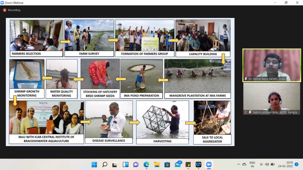 A ‘Practitioner’s conference’ was arranged to discuss conservation-linked livelihoods in the Sundarban, the scope of SAIME to promote Integrated Mangrove Aquaculture (IMA), and alternative livelihood options in the Sundarban. Scope and challenges of natural feed-based brackish water aquaculture, organic shrimpcertification, trade, and value chain in India were also discussed. Representatives from BEDS also participated in the conference.