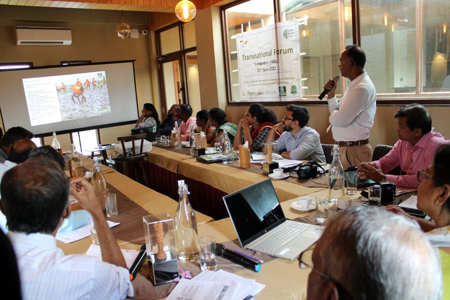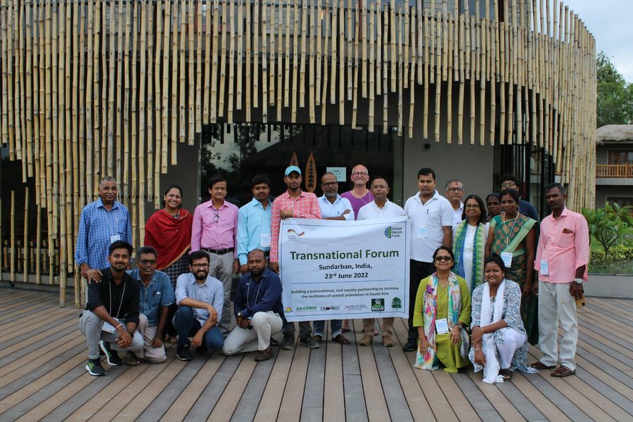 (Aiming to develop a strong partnership between Civil Society Organisations, exchange ideas, and strengthen capacities, a Trans-National Forum under the project, Building a multi-country, civil society partnership to increase the resilience of coastal populations in South Asia was organized by Nature Environment & Wildlife Society (NEWS) with support and guidance from Global Nature Fund on 23 June, 2022 at Sonar Bangla, Dulki, Sundarban. In this workshop, the peer-to-peer learning exercises acted as an exercise for young leaders from the CSOs to learn new methods in policy advocacy and soft skills such as communication that are vitally required for the CSOs to implement various programs. The discussions in the workshop focused mainly on the Protection and restoration of coastal ecosystems (esp. mangrove forests), income diversification for improving resilience, applying innovative techniques for improving food security and adaptation, and decarbonization of coastal communities (zero carbon goal).