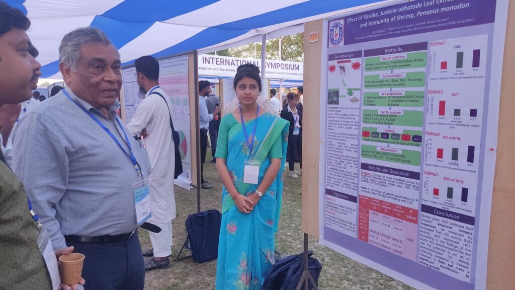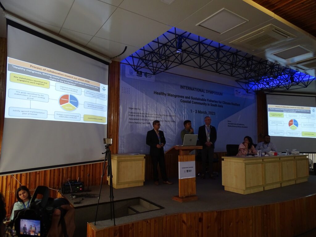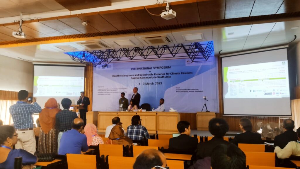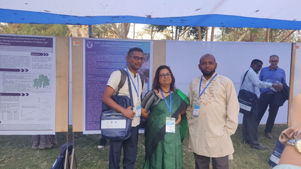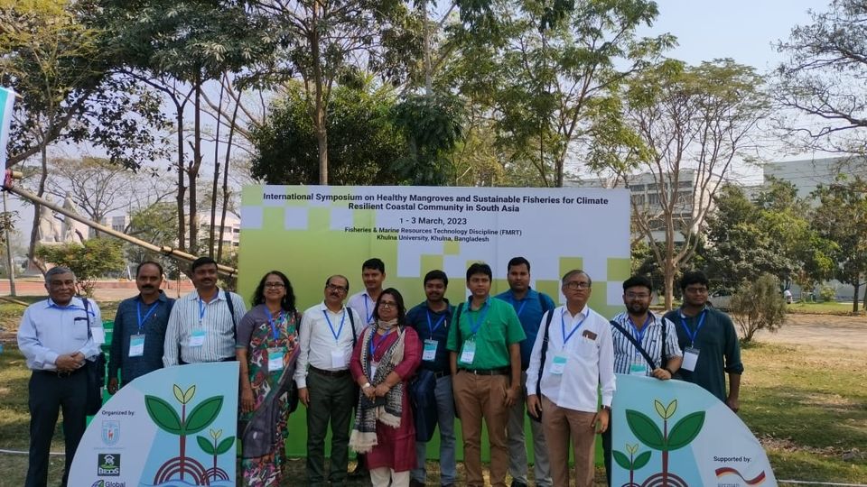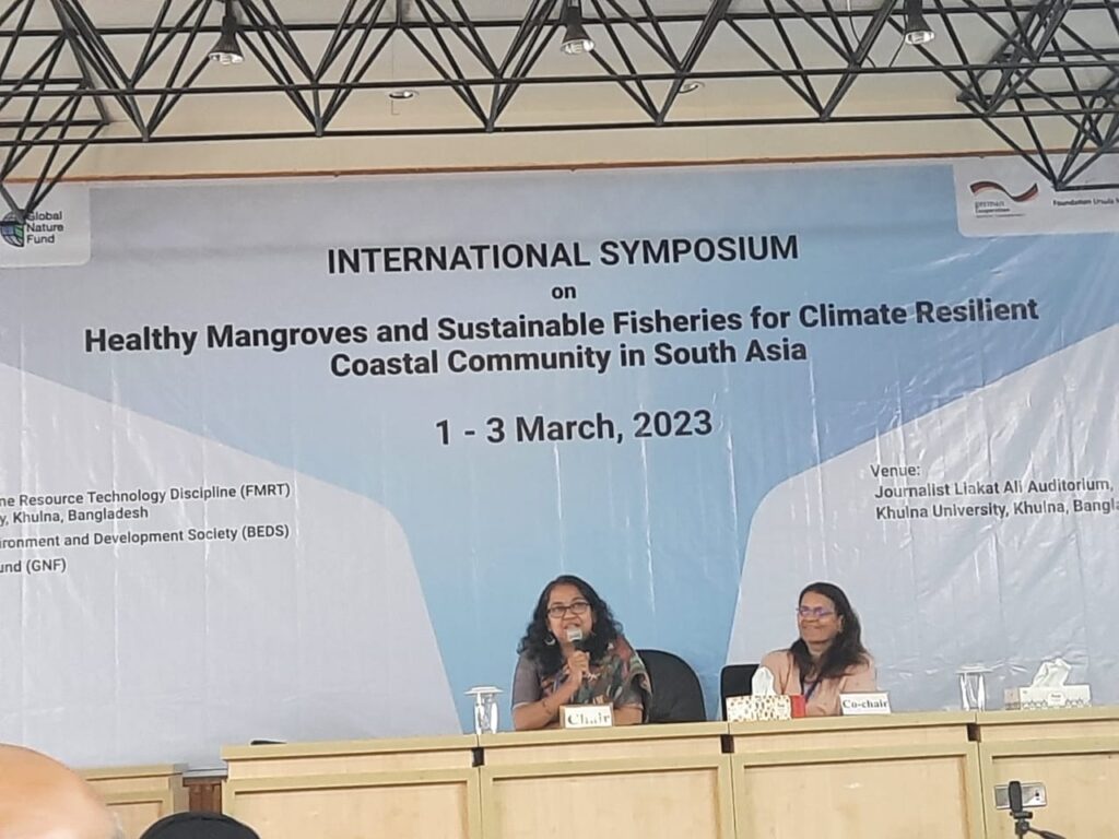 (Recently, the NEWS team participated in an International Symposium titled ‘Healthy Mangroves and Sustainable Fisheries for Climate Resilient Coastal Communities in South Asia’ held at Khulna University, Khulna, Bangladesh on the 1st and 2nd of March, 2023. The Symposium was jointly organized by Khulna University, Bangladesh Environment and Development Society (BEDS), and Global Nature Fund (GNF). One of the scientific sessions of the Symposium titled “Inclusive and equitable market and value chains development” was chaired by Ms. Ajanta Dey, Joint Secretary & Programme Director of NEWS. Dr. J. R. B. Alfred, President of NEWS, was one of four evaluators for the “Poster Competition” held by Khulna University as a part of the symposium. NEWS also took part in the poster competition showcasing their research on the smokeless chulha and reduced dependence of women on forest resources. The NEWS team along with their partners in SAIME (Sustainable Aquaculture in Mangrove Ecosystems) #GNF, #Naturland and #BEDSBangladesh gave a presentation on the SAIME project and their achievements.. Several renowned international organizations such as GNF, Naturland, GLOBAL G.A.P., EMACE Foundation, The Centre for Research on New International Economic Order (CReNIEO) CReNIEO, Nagenahiru Foundation, TERRE Policy Centre, SaciWATERS, Huvadhu AID, The Nature Conservancy, One Tree Planted, Eco-social solutions also participated in this symposium.